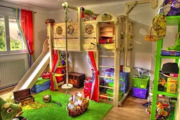 Otra alternativa que nos encanta son las camas de tres niveles como la que podemos ver a continuación. Ideales en caso de que hayan tres hermanos que deban compartir la misma habitación, o también para tener una cama extra para cuando tienen visitas de sus amiguitos.
