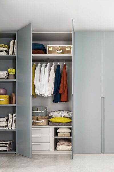 En el interior de cualquier armario también podemos optimizar el espacio según nuestras necesidades con estantes a medida. Adapta la altura de los estantes dependiendo de lo que tengas pensado guardar para no desperdiciar así espacio. Además existen diferentes maneras de hacerlo. Una de esas alternativas son las baldas que se extraen y permiten que accedamos mejor a la parte del interior, por ejemplo…