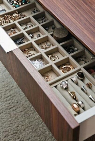 Dentro de los cajones de los armarios podemos guardar desde piezas como camisetas hasta complementos más pequeños. Lo importante en este caso es que usemos separadores y organizadores, sobre todo si usamos los cajones para pequeñas prendas de ropa como la ropa íntima. Aunque pensemos que estos separadores ocupan demasiado, será mucho más recomendable porque nada se mueve de su sitio y se aprovecha mejor el fondo del cajón.