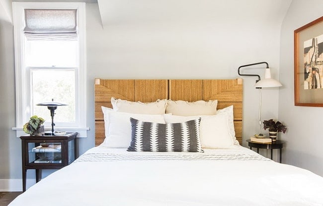 Otra solución es combinar mesitas de noche de materiales distintos (madera, metal, fibras vegetales, etc…). De este modo conseguiremos darle al dormitorio un plus de originalidad. Colocar modelos diferentes a cada lado de la cama añade interés visual, además de incorporar diversas al espacio.