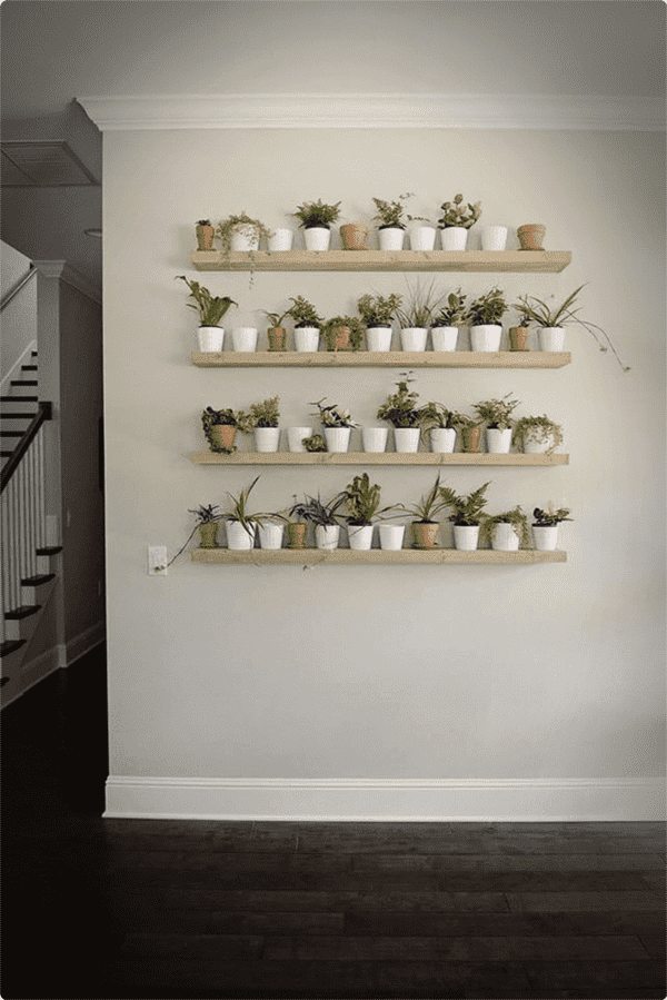 Entre otras opciones se conocen las ideas en estantes para macetas, estas ideas se pueden llevar a cabo de dos maneras. Una es con sola hilera de macetas sobre un estante o bien como en la imagen aquí abajo varios estantes que decoren gran parte del muro.