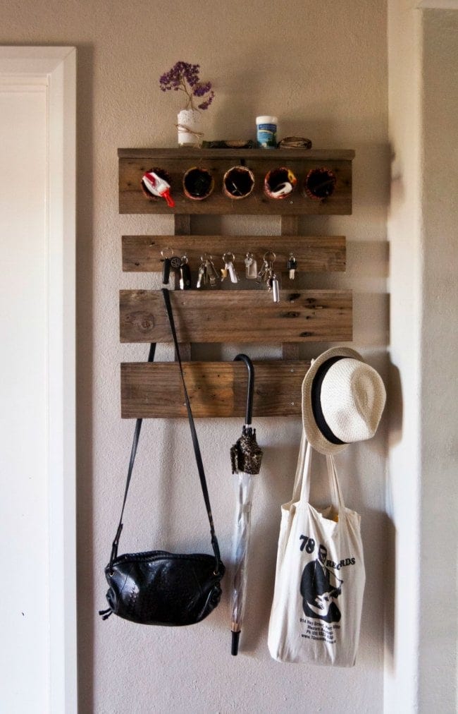 Los muebles de palets para el recibidor forman parte de una buena opción para utilizar ideas creativas incorporadas al diseño. Un recorte de este material puede ser modificado con estantes y ganchos para lograr una gran transformación.