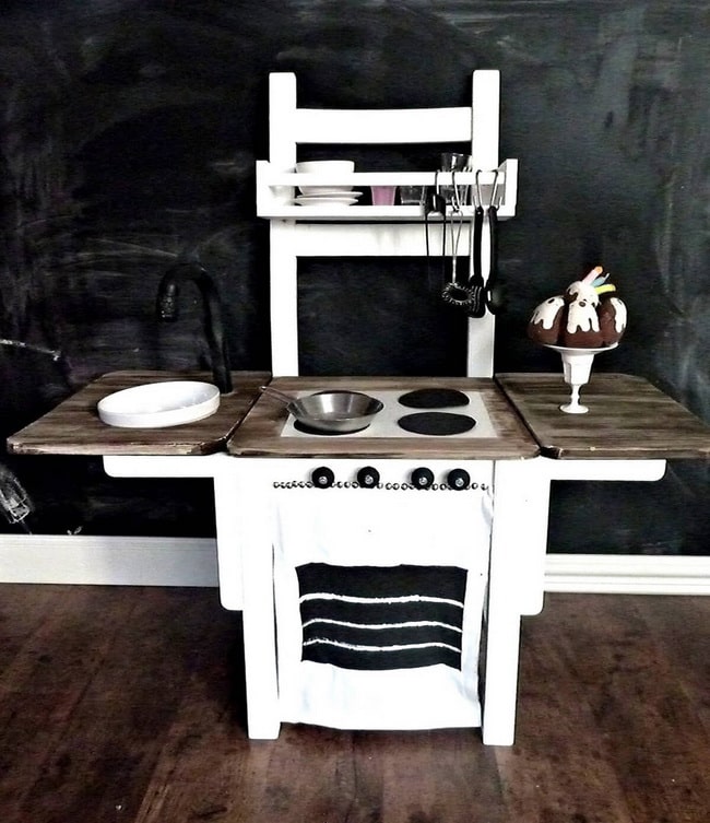 Para hacer esta cocina de juguete se utilizó como base una silla a la que se le agregaron diferentes detalles con madera y pintura. Sin dudas es una buena opción para hacer un mueble diferente y original invirtiendo poco dinero para lograr un hermoso diseño.