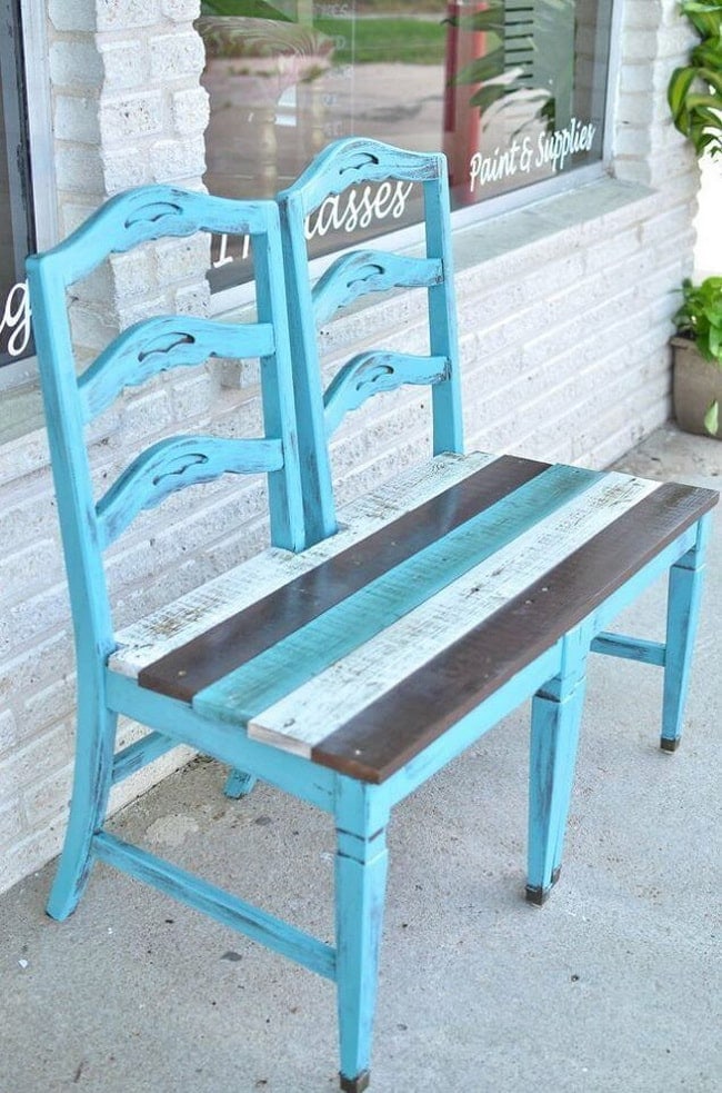 En la fotografía se puede ver que dos sillas se encuentran unidas por las tablas del centro. Esta es una buena forma de hacer un objeto diferente y original.