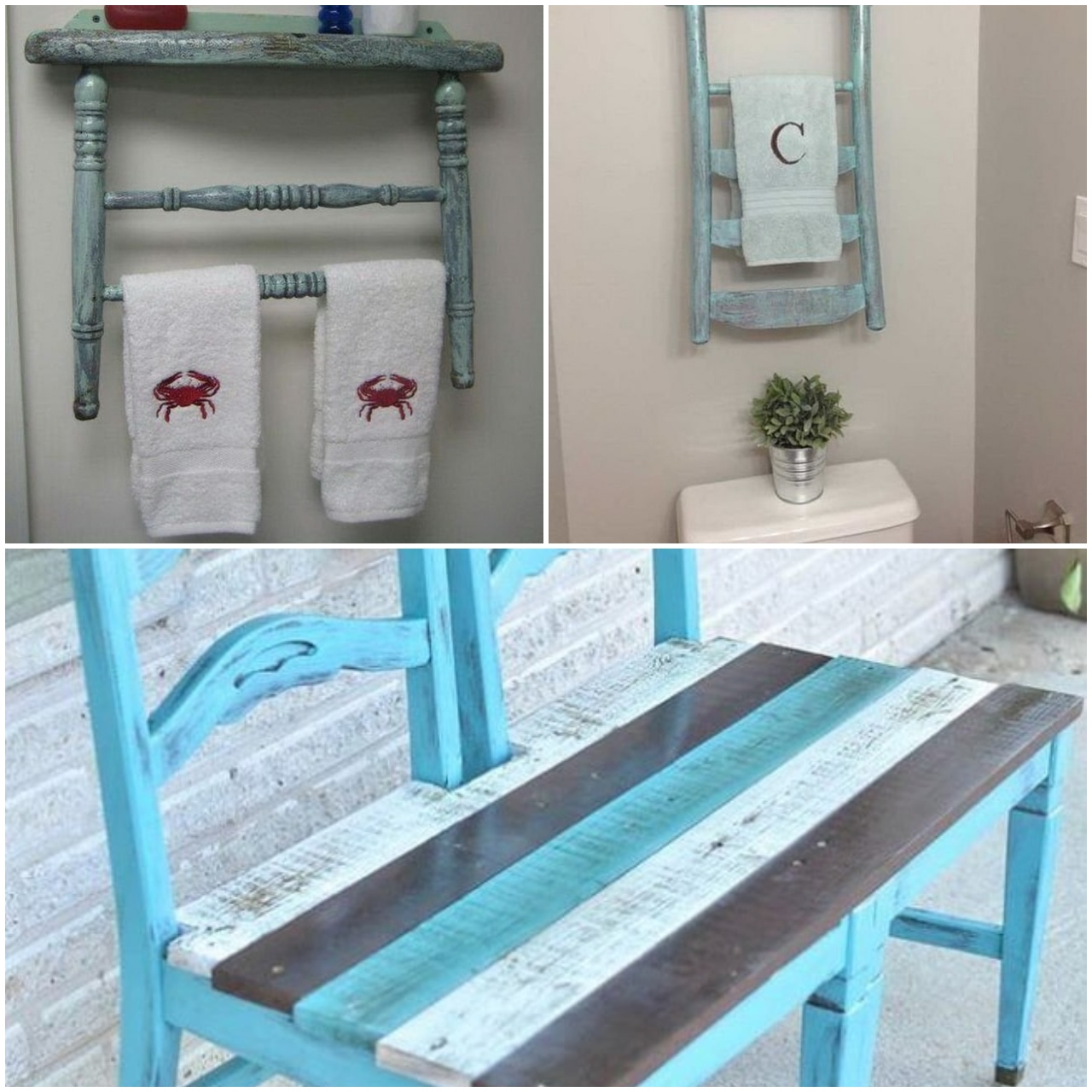 Las sillas pueden ser recicladas de diferentes formas y cada una de ellas aporta un estilo único. Me parece una buena idea la de utilizar una vieja silla para organizar los productos del baño. Necesitas pocos materiales para lograr un estilo renovado.