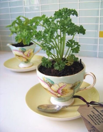 Las viejas tazas de café pueden ser unas aliadas increíbles para plantar pequeñas macetitas. Además, podemos colocarlas en la cocina con plantas para cocinar como puedan ser menta, tomillo o romero.