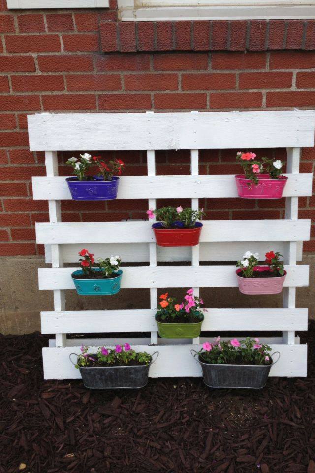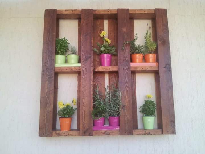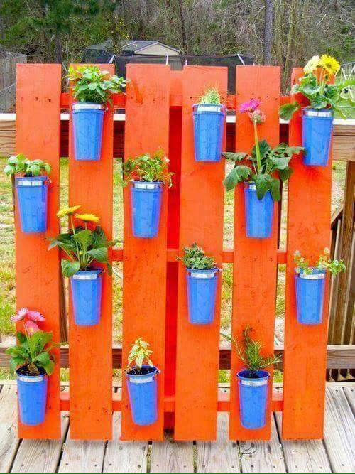 Macetas de todo tipo y color y palets de madera reciclados de varias maneras, pintados a veces con colores llamativos y otras veces solamente barnizados. Encuentra la foto que más te gusta y hazlo tú mismo en tu casa!