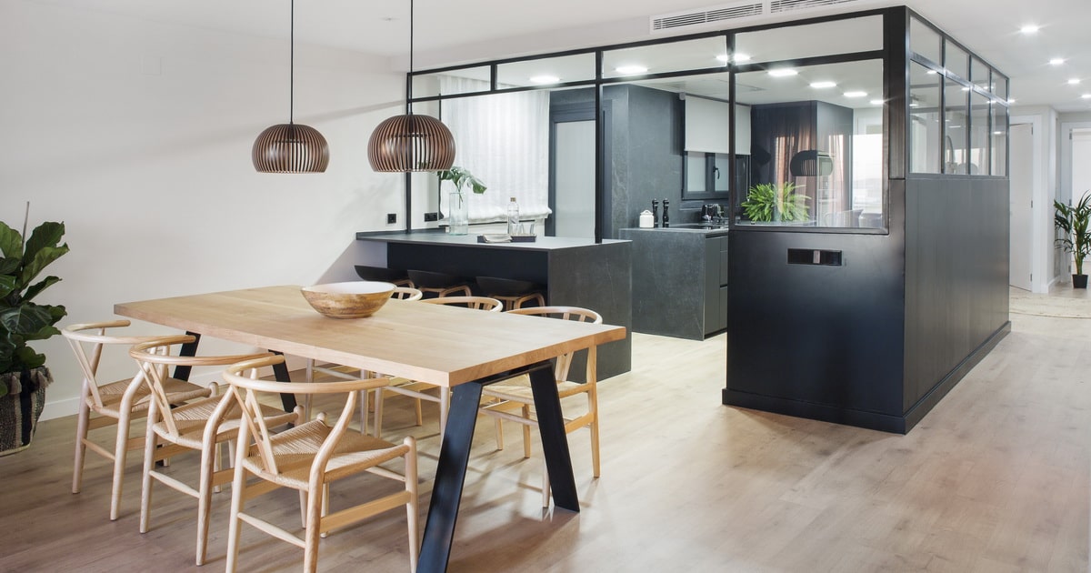 La estructura en negro que se ve al entrar a la vivienda es un cerramiento de cocina. Si, se trata de una cocina acristalada, delimitada pero presente. Se ha optado por un tabique a media altura con cristales hasta el techo.